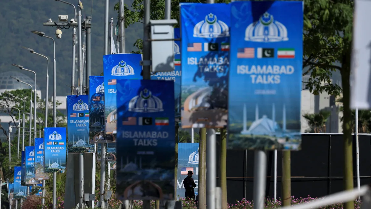 ملصقات إعلانية كُتب عليها "محادثات إسلام آباد" قبيل استضافة باكستان الجولة الثانية من المفاوضات بين أميركا وإيران. 22 أبريل 2026 - Reuters