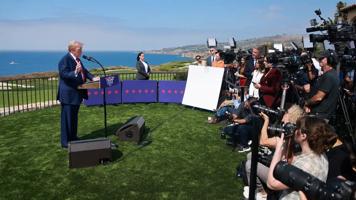المرشح الجمهوري دونالد ترمب يتحدث خلال مؤتمر صحافي في نادي ترمب الوطني للجولف في لوس أنجلوس في رانشو بالوس فيرديس، كاليفورنيا. 13 سبتمبر 2024 - Reuters