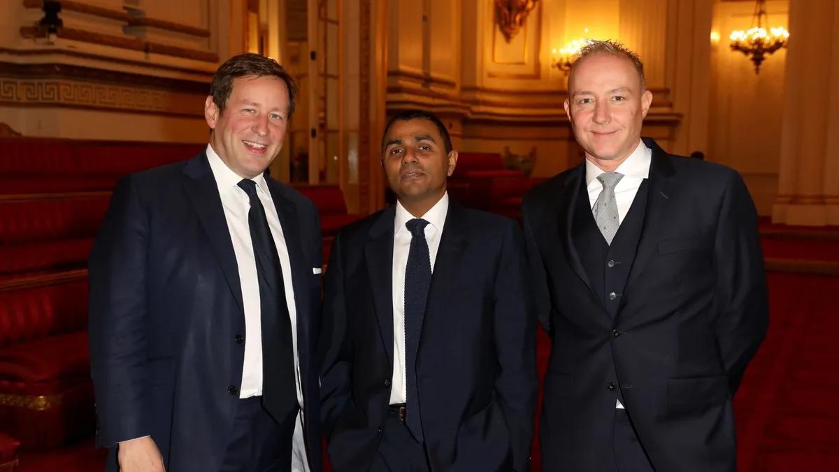 رجل الأعمال البريطاني وحيد علي (وسط) مع عضو مجلس اللوردات إيد فايزي (يسار) وأحد الضيوف خلال فعالية في قصر باكنجهام بلندن. 17 نوفمبر 2016 - gettyimages