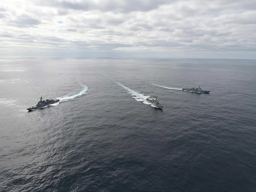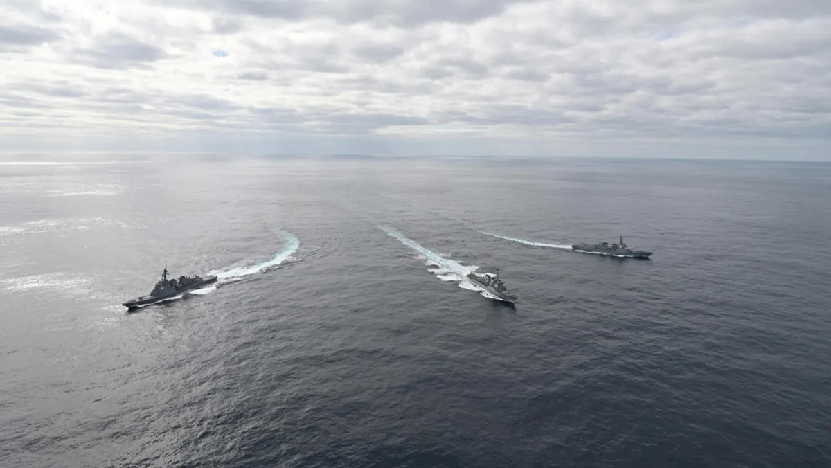 سفن من البحرية اليابانية والأميركية والكورية الجنوبية تشارك في مناورة ثلاثية في بحر اليابان المعروف باسم بحر الشرق. 22 فبراير 2023 - Reuters