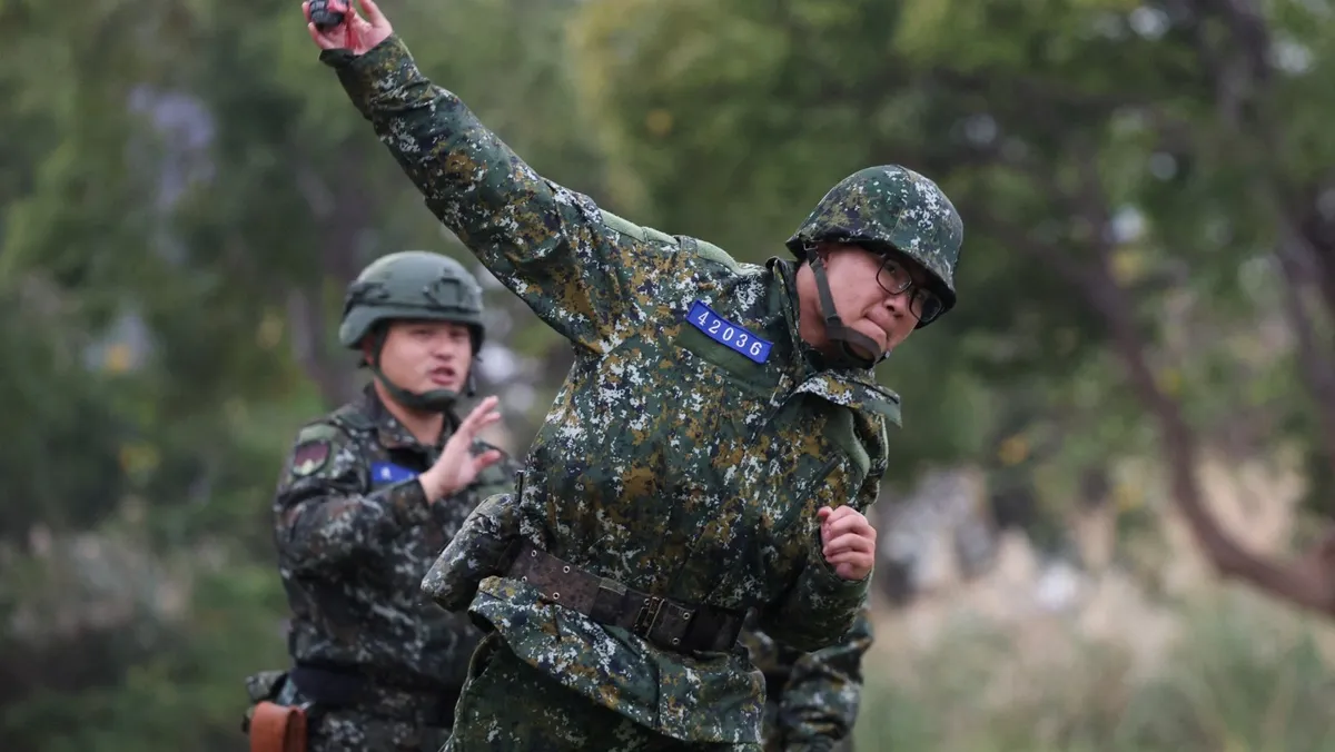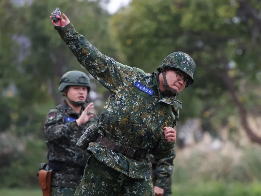 جندي تايواني يتدرب على إلقاء القنابل في قاعدة عسكرية في شين جو، تايوان. 6 فبراير 2024 - Reuters