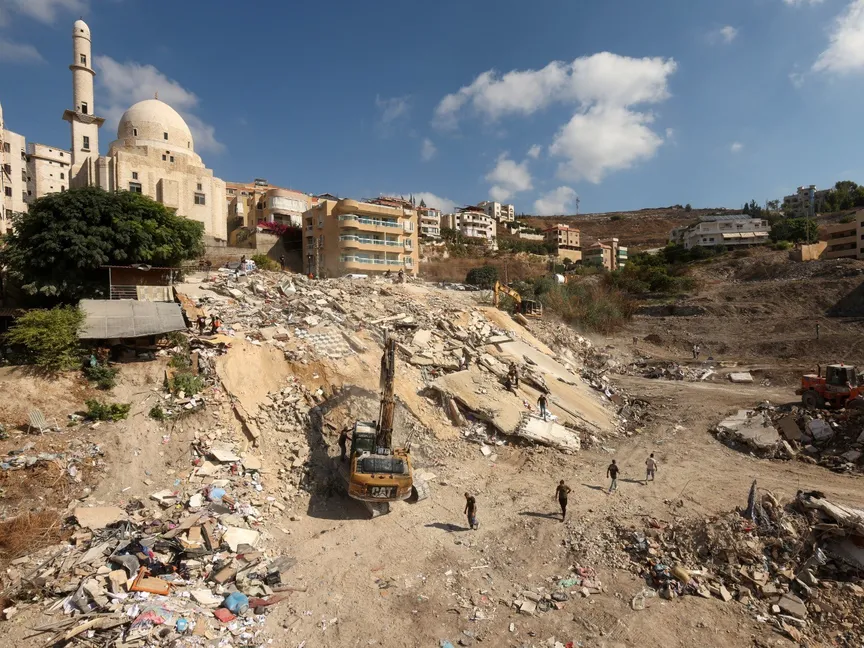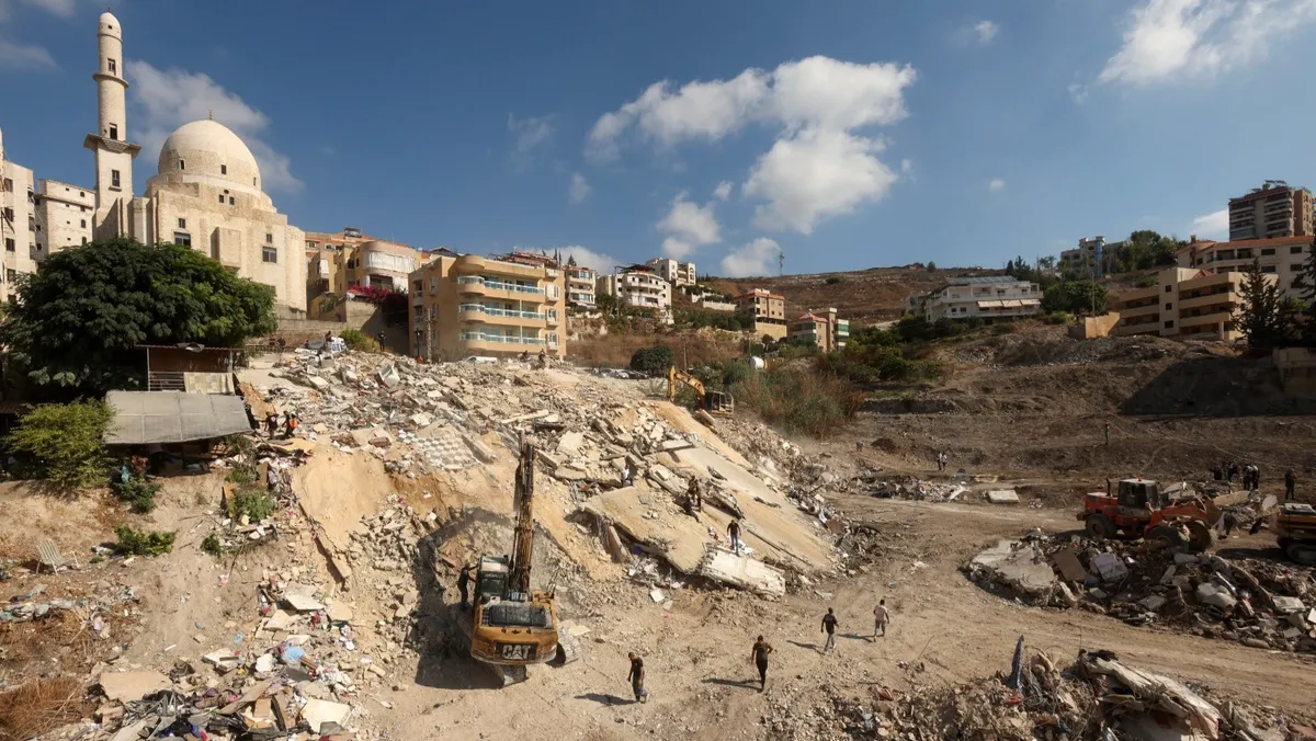 رجال الإنقاذ يعملون في موقع قصفته إسرائيل بمدينة عين دلب في جنوب لبنان. 30 سبتمبر 2024 - Reuters
