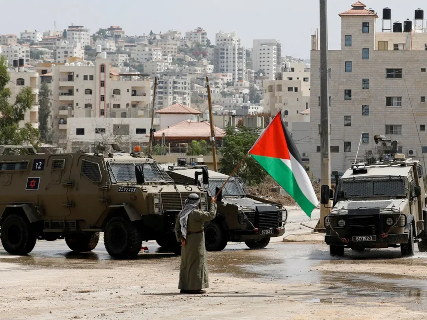 رجل فلسطيني يحمل علم فلسطين بجوار مركبات عسكرية إسرائيلية خلال اقتحامها مدينة طولكرم في الضفة الغربية المحتلة. 22 أغسطس 2024 - REUTERS