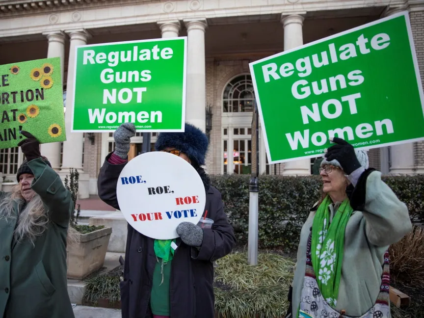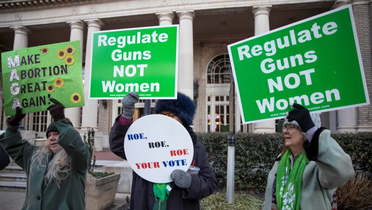 متظاهرات تؤيدن حق الإجهاض في جورجيا ترفعن لافتات تطالب بتقييد السلاح وليس حقوق النساء. 20 يناير 2024 - Reuters