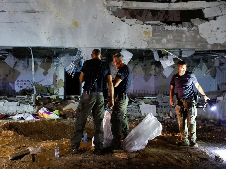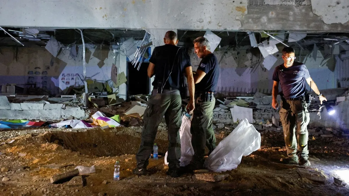جنود من الجيش الإسرائيلي يتفقدون موقعاً أصابه صاروخ إيراني وسط الهجوم الإيراني غير المسبوق على إسرائيل. وسط إسرائيل.1 أكتوبر 2024 - REUTERS