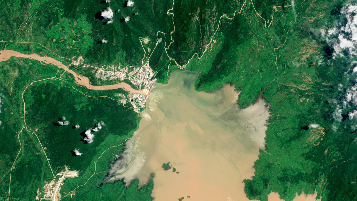 صورة بالأقمار الصناعية لبحيرة سد النهضة الإثيوبي بعد بدء الملء الأول. 13 أغسطس 2020. - Getty Images