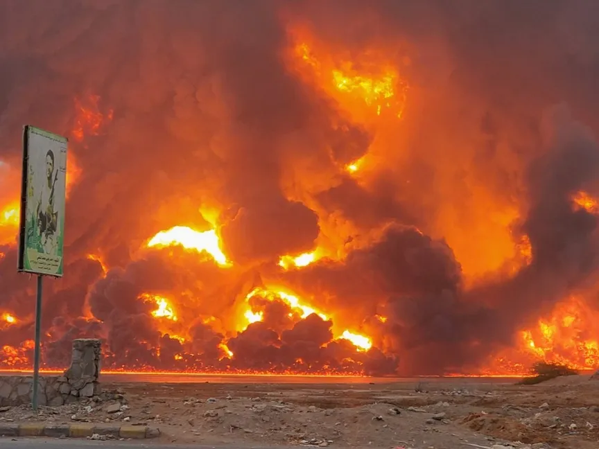 ألسنة النيران تتصاعد من منشآت تخزين النفط في ميناء الحديدة باليمن جراء غارات إسرائيلية على المدينة. 20 يوليو 2024 - twitter/TvAlmasirah