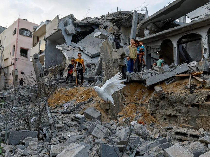 أطفال فلسطينيون بين انقاض المنازل التي دمرتها الضربات الإسرائيلية على خان يونس جنوبي قطاع غزة. 11 أكتوبر 2023 - Reuters