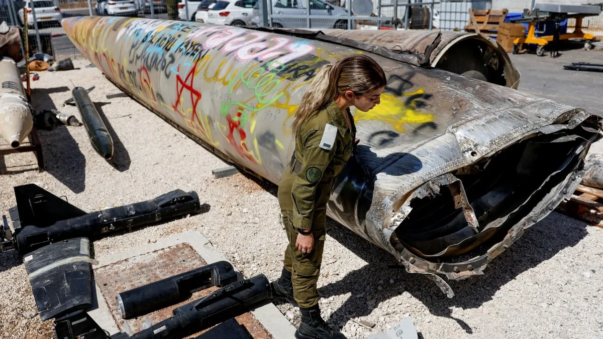 جندي إسرائيلية تقف بجانب بقايا صاروخ باليستي إيراني من طراز "عماد" في قاعدة عسكرية بجنوب إسرائيل. 9 أكتوبر 2024 - REUTERS