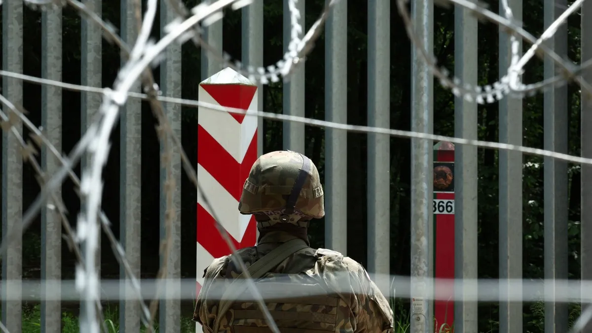 جندي يقف بالقرب من السياج على الحدود البيلاروسية- البولندية بالقرب من بيالوفيجا في بولندا. 4 يونيو 2024 - reuters