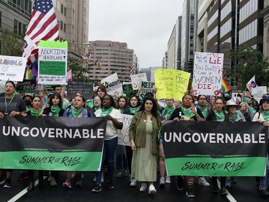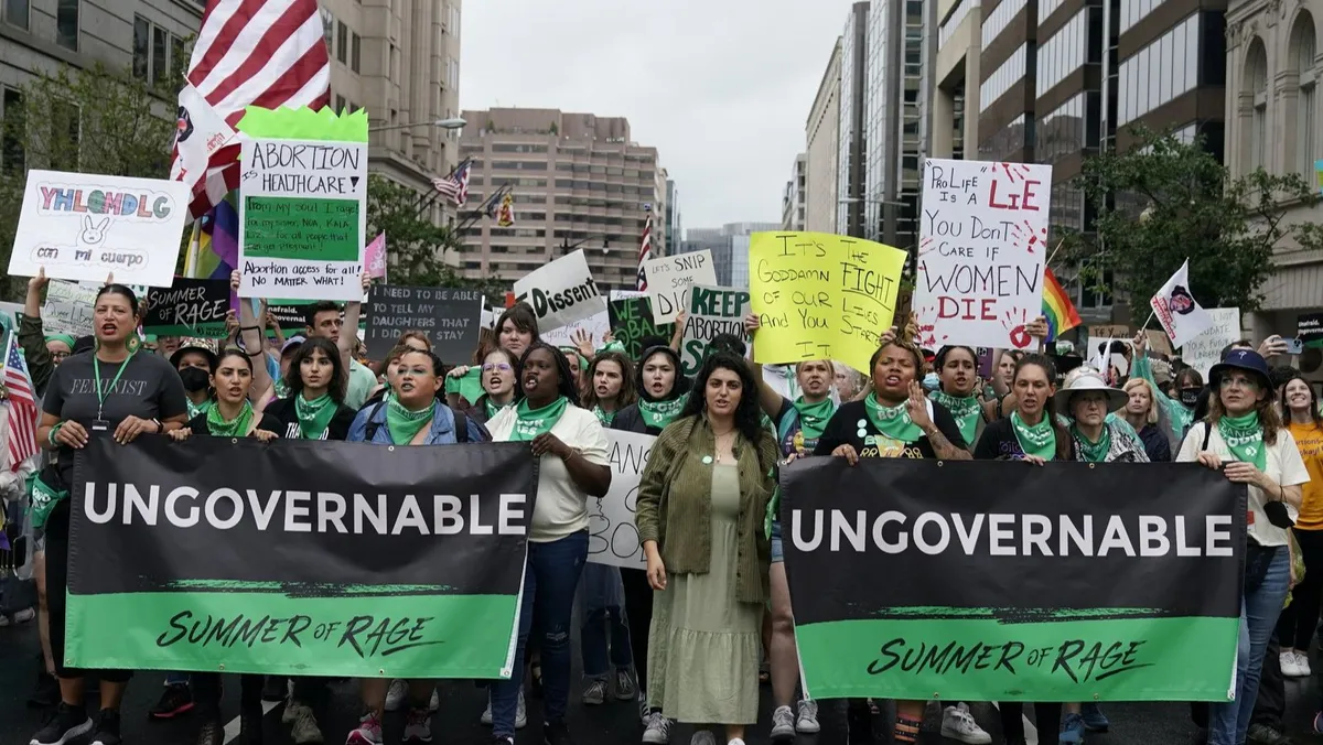 مسيرة لناشطات احتجاجاً على قرار المحكمة العليا الأميركية بإلغاء حق الإجهاض بالعاصمة واشنطن - 9 يوليو 2022 - REUTERS