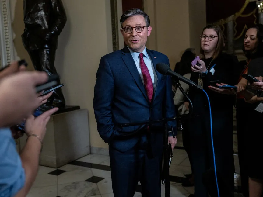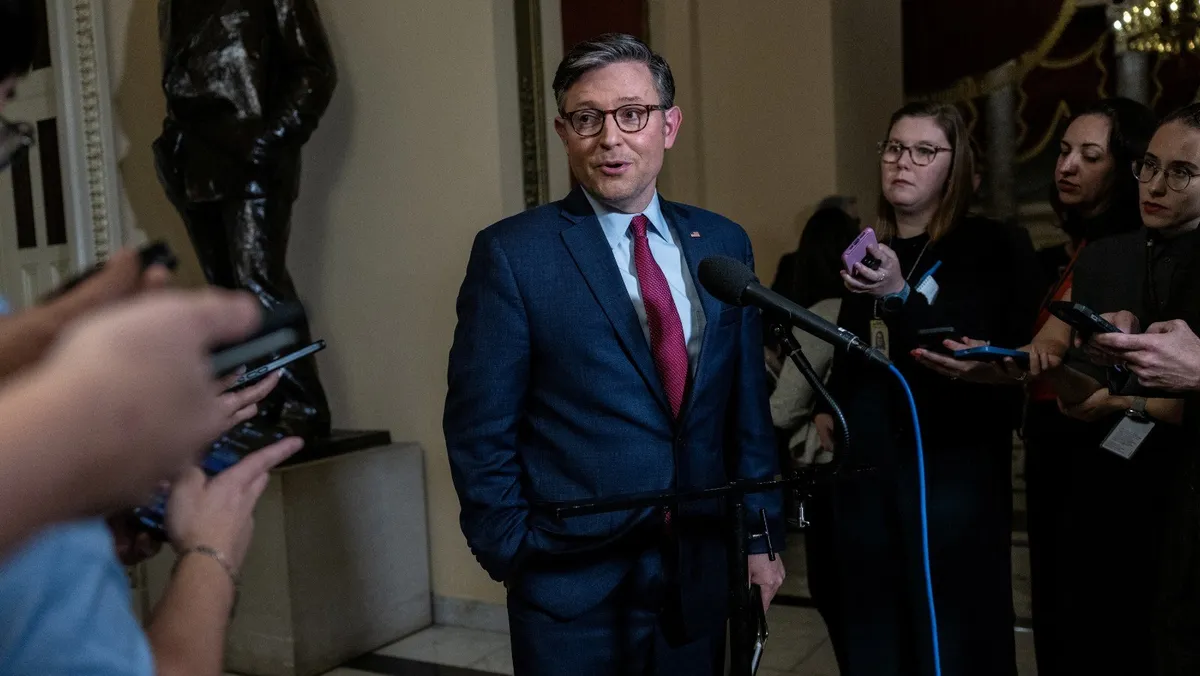 رئيس مجلس النواب الأميركي مايك جونسون يتحدث للصحافيين في مبنى الكابيتول، 19 سبتمبر 2024 - REUTERS