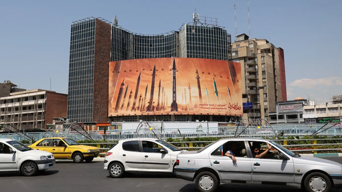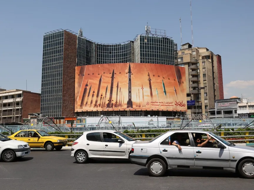 لوحة إعلانية مناهضة لإسرائيل تحمل صورة صواريخ إيرانية في أحد شوارع طهران، إيران. 19 أبريل 2024 - Reuters