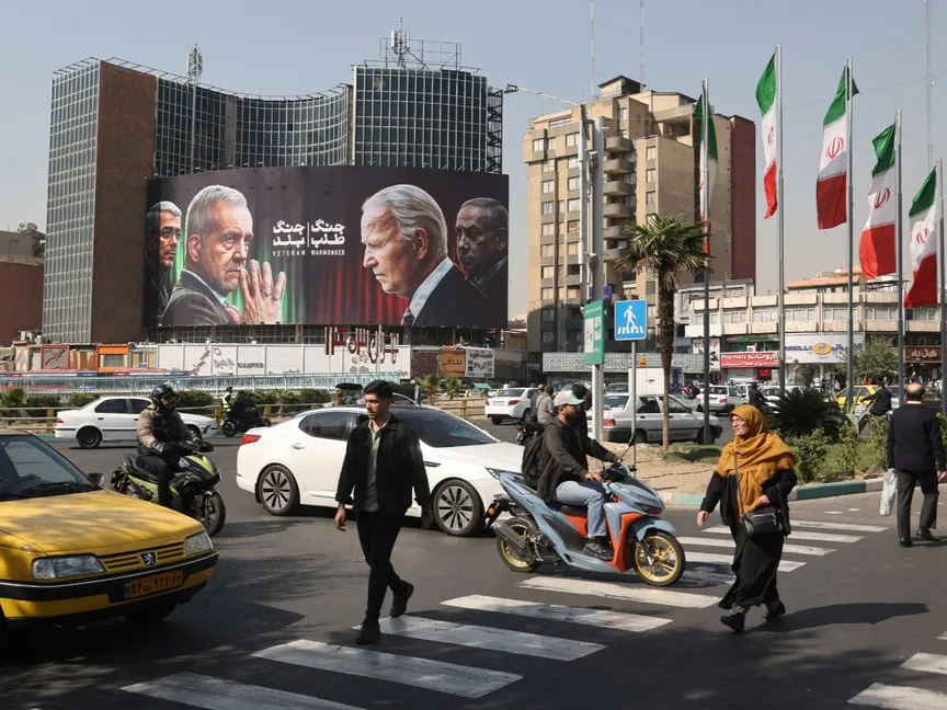 إيرانيون يسيرون بجوار لوحة إعلانية عليها صور الرئيس الإيراني مسعود بيزشكيان ورئيس أركان القوات المسلحة الإيرانية اللواء محمد باقري والرئيس الأميركي جو بايدن ورئيس الوزراء الإسرائيلي بنيامين نتنياهو، في أحد شوارع طهران. 27 أكتوبر 2024 - Reuters