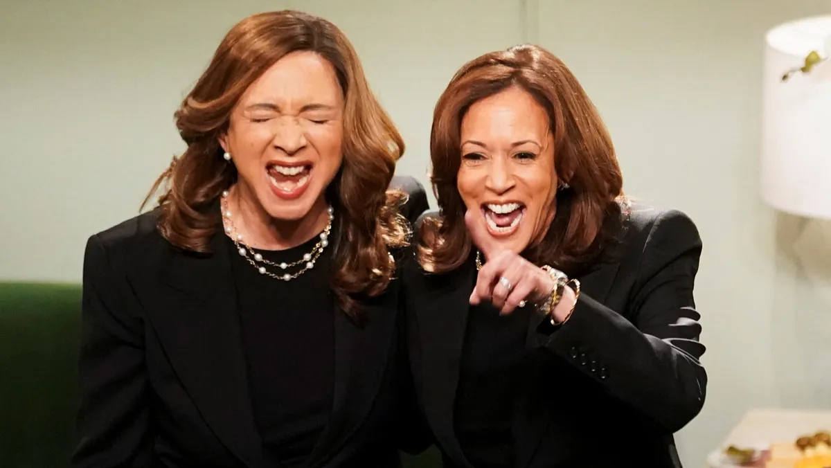 وأثناء تلك الفقرة وقفت هاريس إلى جانب رودولف في المشهد، بملابس سوداء متطابقة ونفس تصفيفة الشعر والحلي المصنوعة من اللؤلؤ، وهما تحدقان في بعضهما البعض عبر طاولة تزين، وكأنها تريان انعكاسهما في المرآة، بينما تستعد هاريس بتوتر لخطاب حملتها.