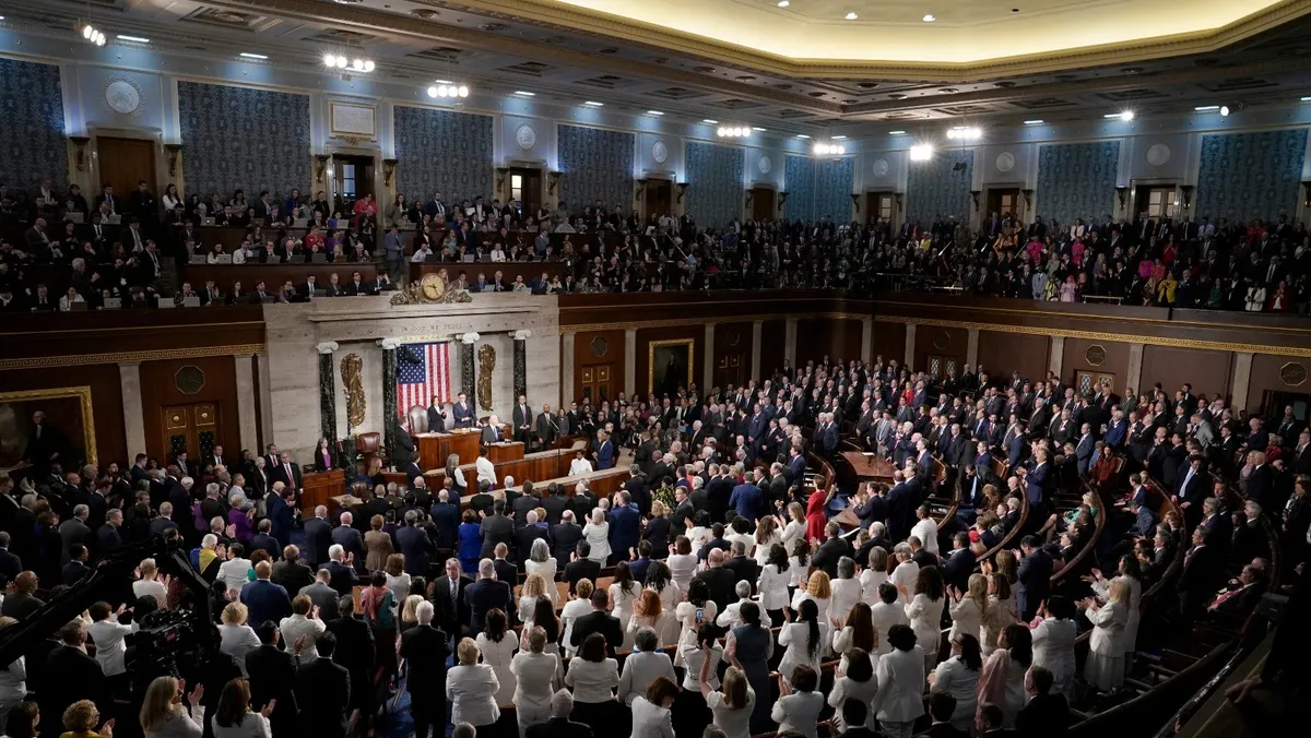 الرئيس الأميركي جو بايدن يلقي خطاب حالة الاتحاد في في قاعة مجلس النواب في مبنى الكابيتول بالعاصمة واشنطن. 7 مارس 2024 - Reuters