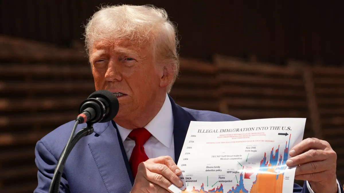 الرئيس الأميركي المنتخب دونالد ترمب يحمل مخططاً لإحصاءات الهجرة خلال زيارة لتفقد الحدود مع المكسيك في مقاطعة كوتشيز بولاية أريزونا. 22 أغسطس 2024 - REUTERS