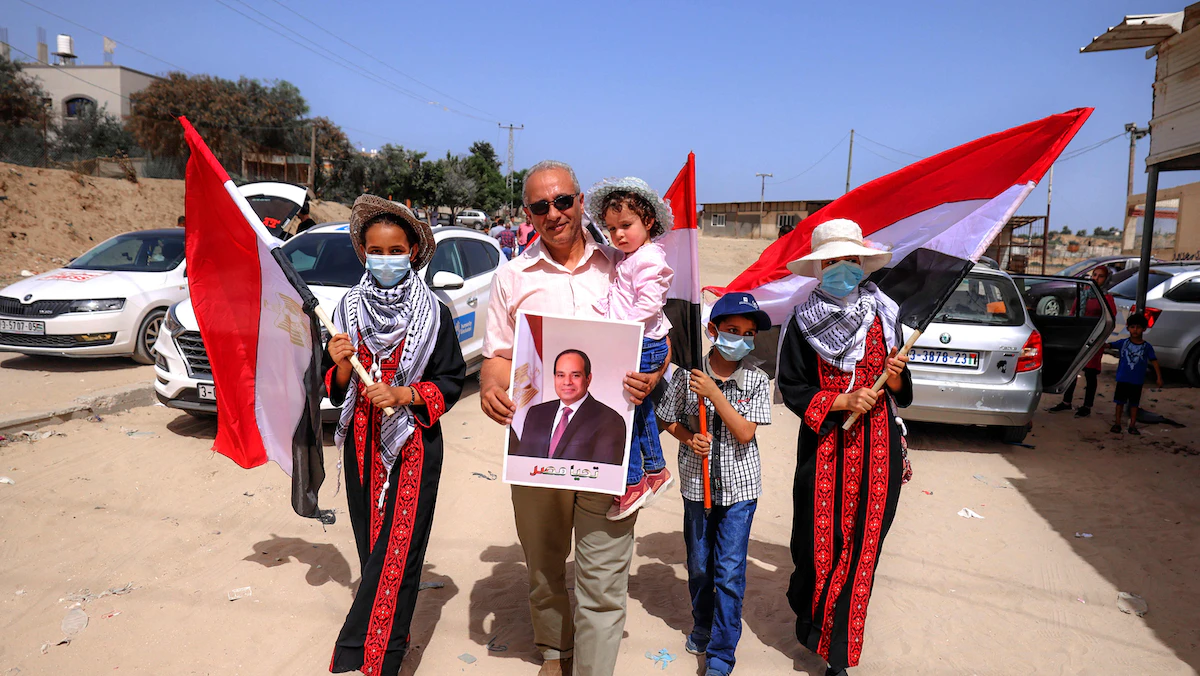 أسرة فلسطينية من قطاع غزة تحمل أعلام مصر وصورة للرئيس المصري عبد الفتاح السيسي خلال زيارة مدير المخابرات عباس كامل للقطاع - 31 مايو 2021 - AFP