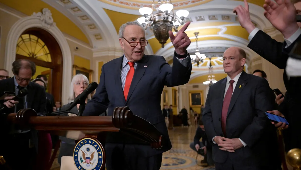 زعيم الأغلبية في مجلس الشيوخ الأميركي تشاك شومر خلال مؤتمر صحافي في مبنى الكابيتول بواشنطن. 14 مارس 2024 - Reuters