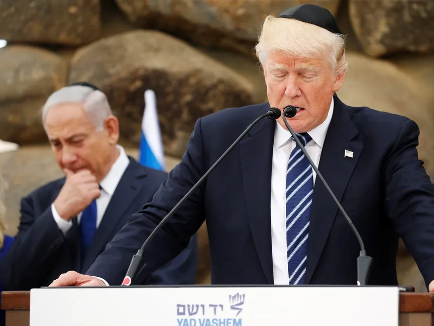 الرئيس الأميركي السابق دونالد ترمب رفقة رئيس الوزراء الإسرائيلي بنيامين نتنياهو (يسار) يلقي كلمة في النصب التذكاري للهولوكوست في القدس. 23 مايو 2017 - reuters