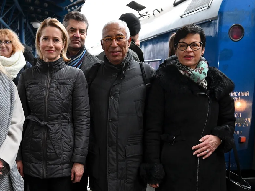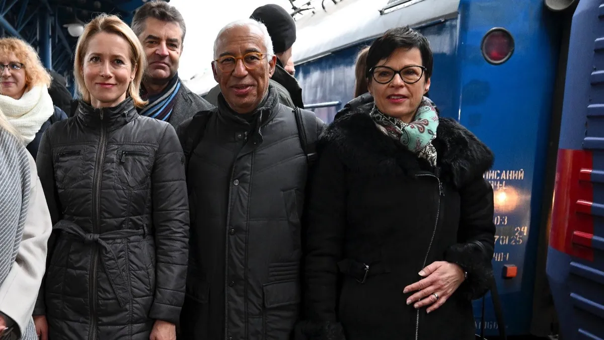 رئيس المجلس الأوروبي أنطونيو كوستا ومسؤولة السياسة الخارجية بالاتحاد الأوروبي كايا كالاس (يسار) المفوضة الأوروبية لتوسيع التكتل مارتا كوس يصلون إلى كييف. 1 ديسمبر 2024 - @eucopresident