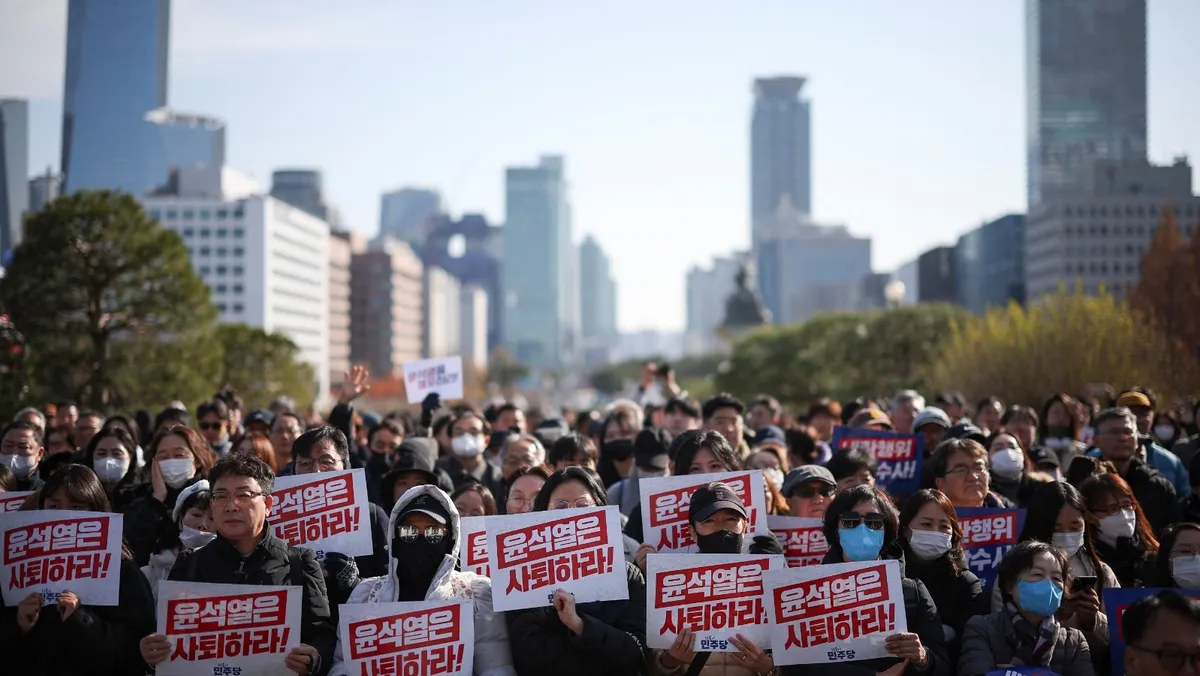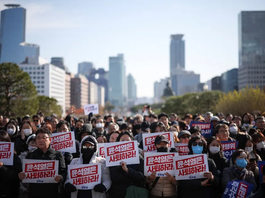 متظاهرون يحملون لافتات كتب عليها "تنحى أيها الرئيس يون سوك يول"على خلفية الأحكام العرفية في الجمعية الوطنية في سول. 4 ديسمبر 2024 - reuters