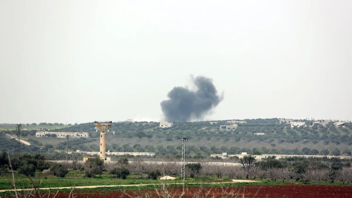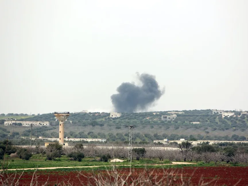 أعمدة الدخان تتصاعد بالقرب من بلدة قمحانة بريف محافظة حماة السورية، خلال قصف لمدفعية القوات الحكومية. أبريل 2017 - AFP