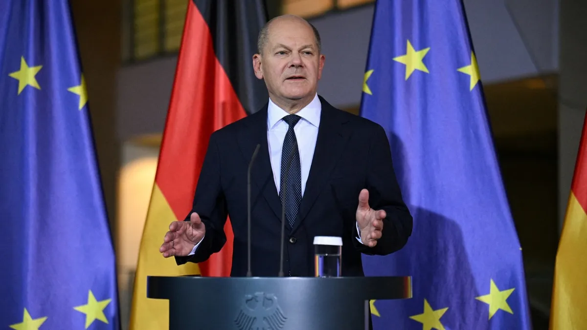المستشار الألماني أولاف شولتز خلال مؤتمر صحافي في مقر المستشارية الاتحادية بالعاصمة برلين. 6 نوفمبر 2024 - REUTERS
