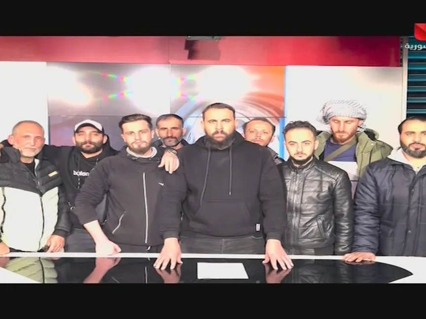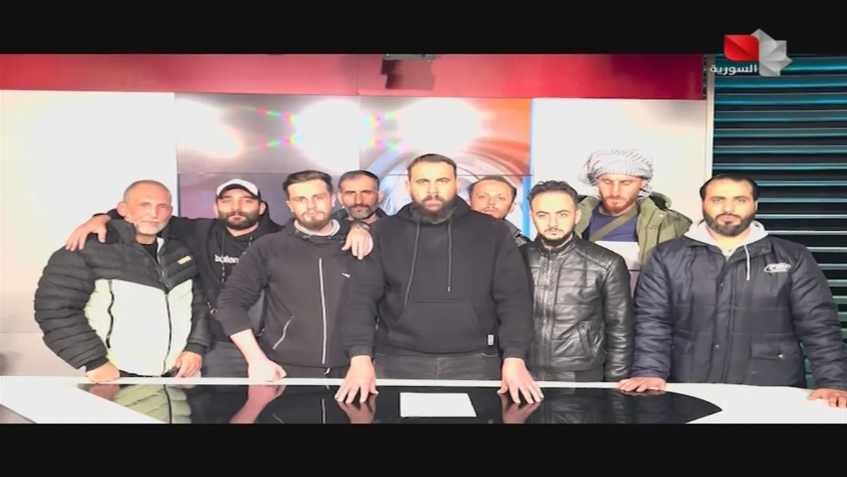 بثّ التلفزيون الرسمي السوري، صباح الأحد، إعلاناً ظهر فيه 9 أفراد، ألقى أحدهم ما قال إنه البيان الرقم (1) من "غرفة عمليات فتح دمشق".