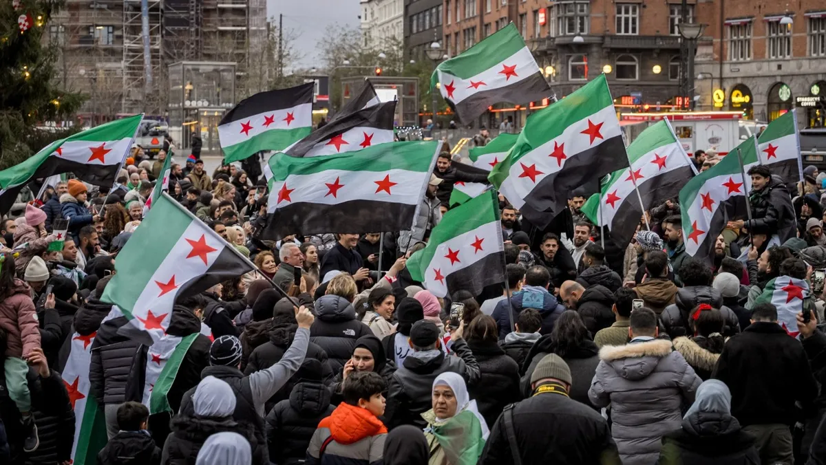 سوريون في الدنمارك يتظاهرون بساحة سيتي هول في كوبنهاجن بعد الإعلان عن سقوط نظام بشار الأسد في سوريا. 8 ديسمبر 2024 - REUTERS