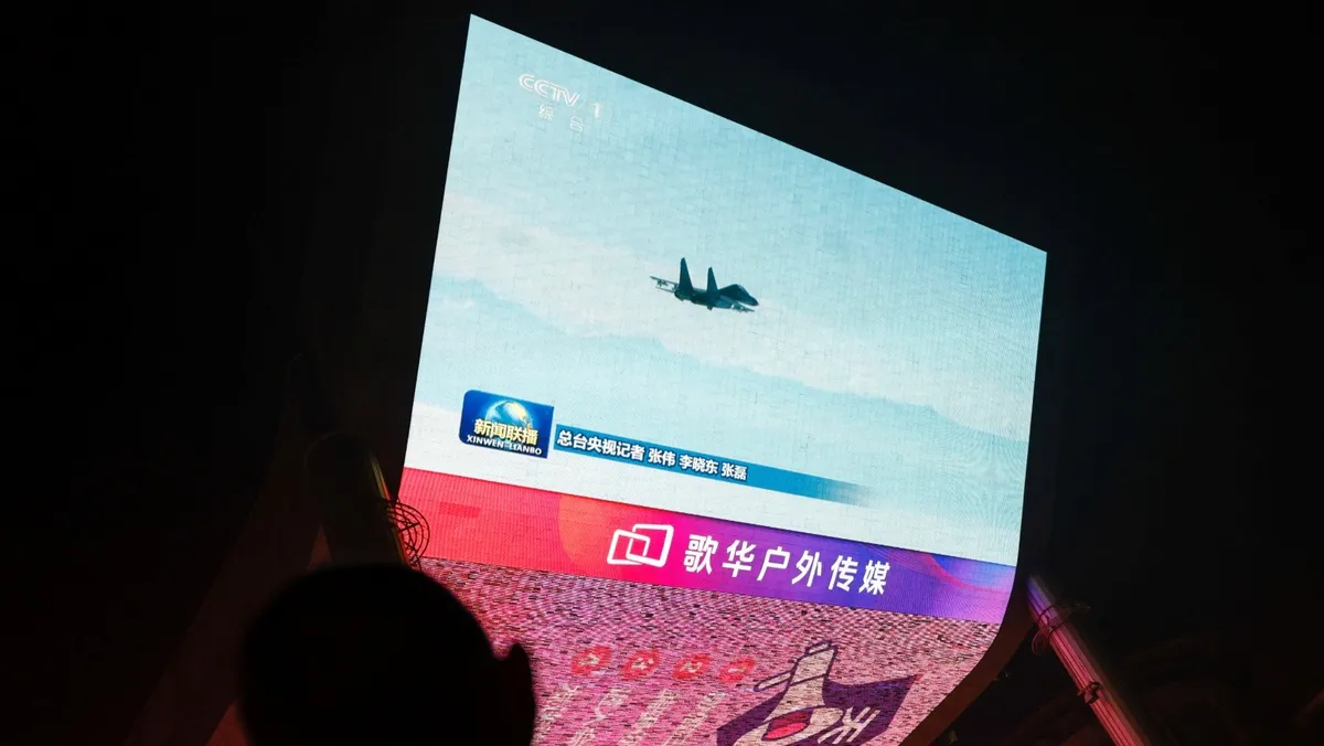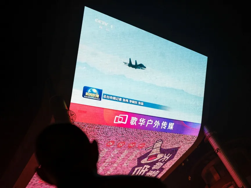 شاشة في بكين تعرض جانب من التدريبات العسكرية للجيش الصيني في مضيق تايوان. 14 أكتوبر 2024 - REUTERS