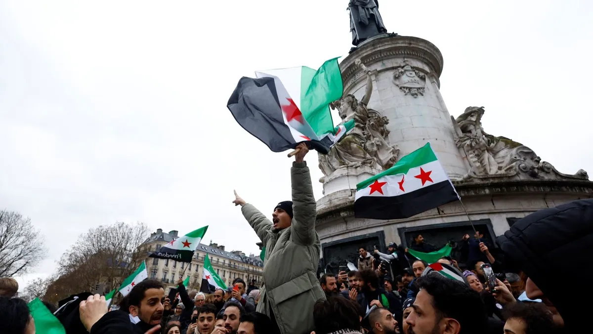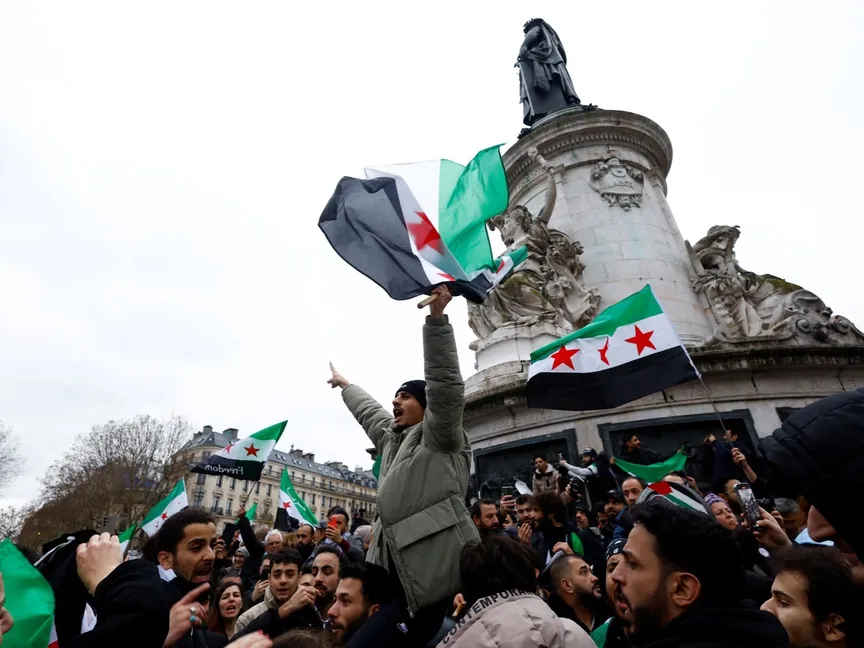 أشخاص يحملون علم المعارضة السورية أثناء احتفالهم في ساحة الجمهورية وسط العاصمة الفرنسية باريس بعد الإطاحة بالرئيس بشار الأسد. 8 ديسمبر 2024 - Reuters