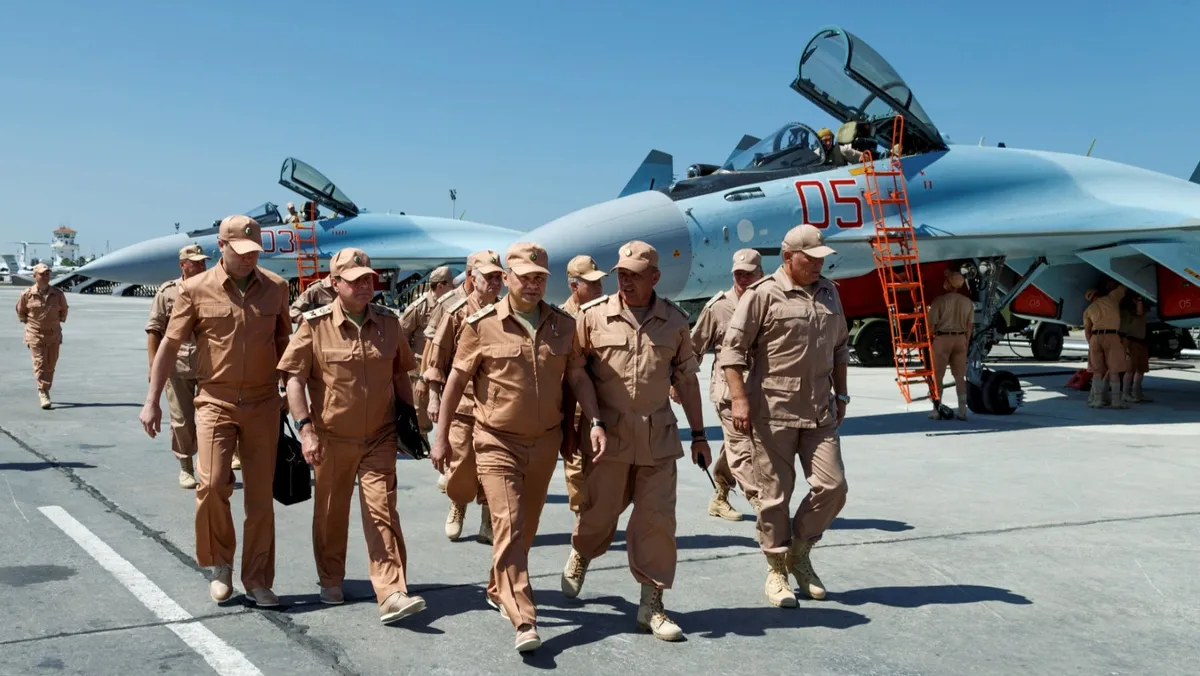 وزير الدفاع الروسي السابق سيرجي شويجو يزور قاعدة حميميم الجوية في سوريا. 18 يونيو 2016 - Reuters