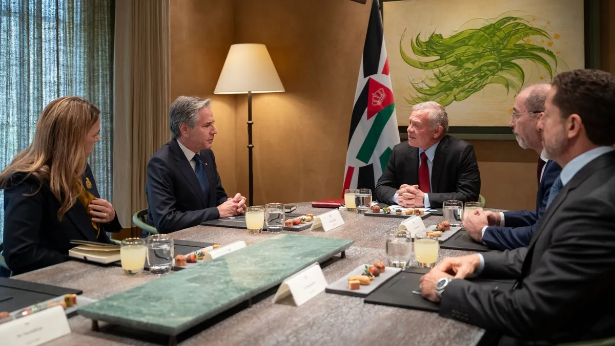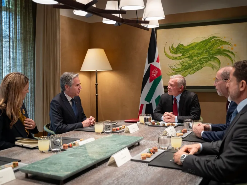 وفيما يتعلق بالحرب الإسرائيلية على غزة، قال البيان إن الوزير وملك الأردن ناقشا "الحاجة الملحة إلى التوصل إلى وقف لإطلاق النار يضمن إطلاق سراح جميع الرهائن".