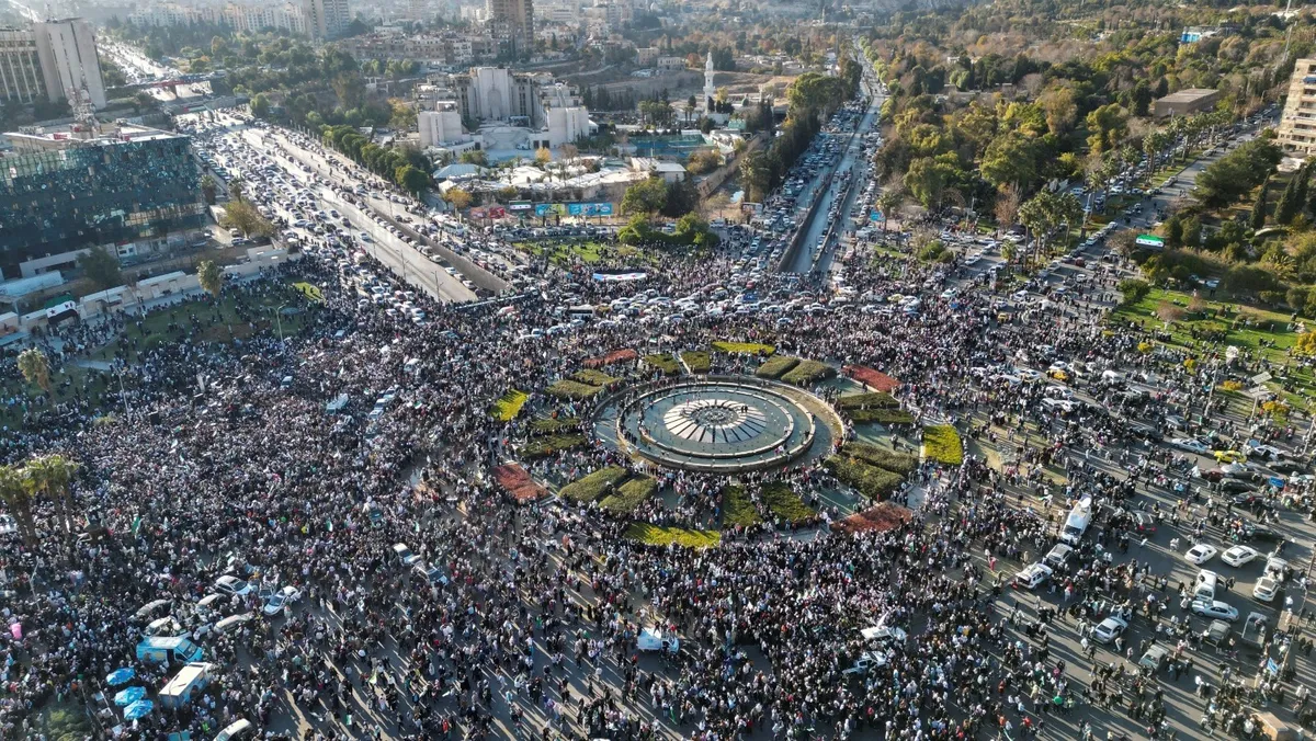واجتمعت حشود كبيرة في ساحة الأمويين وسط العاصمة السورية دمشق، احتفالاً بـ"جمعة النصر" التي انتظرها السوريون طويلاً، بالإضافة إلى ريف دمشق حيث ردد السوريون شعار "سوريا حرة".