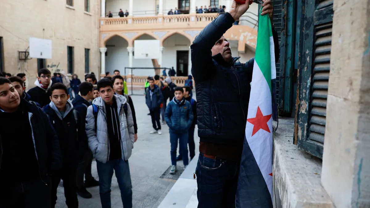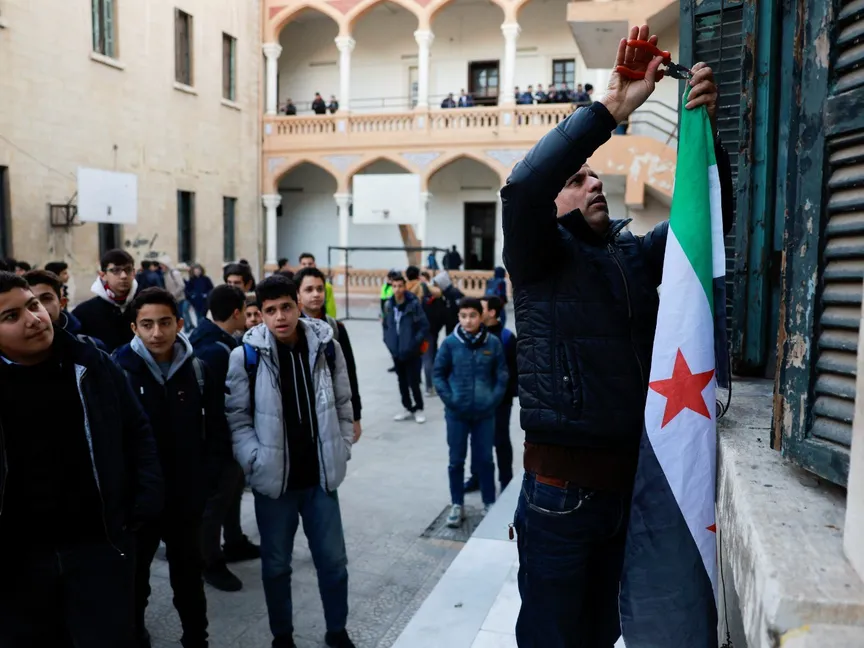 سوري يرفع علم الثورة السورية في مدرسة بدمشق بعد أيام من الإطاحة ببشار الأسد. 15 ديسمبر 2024 - رويترز