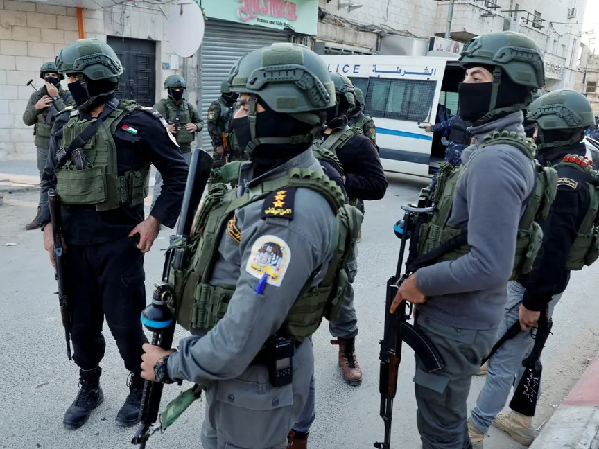 قوات الأمن الفلسطينية تقف بينما يطالب متظاهرون فلسطينيون بإنهاء الاشتباكات بين قوات الأمن والمسلحين في جنين بالضفة الغربية. 16 ديسمبر 2024 - reuters