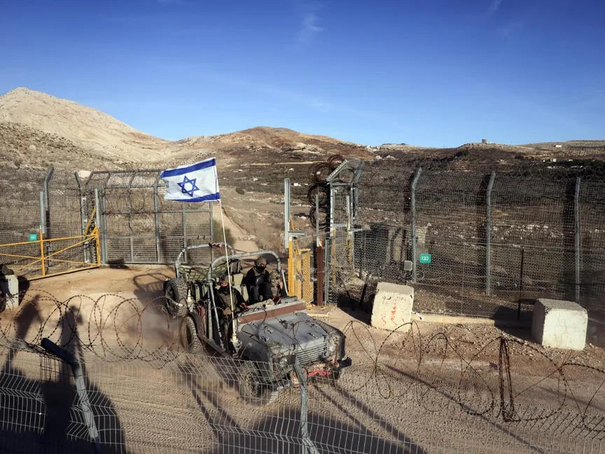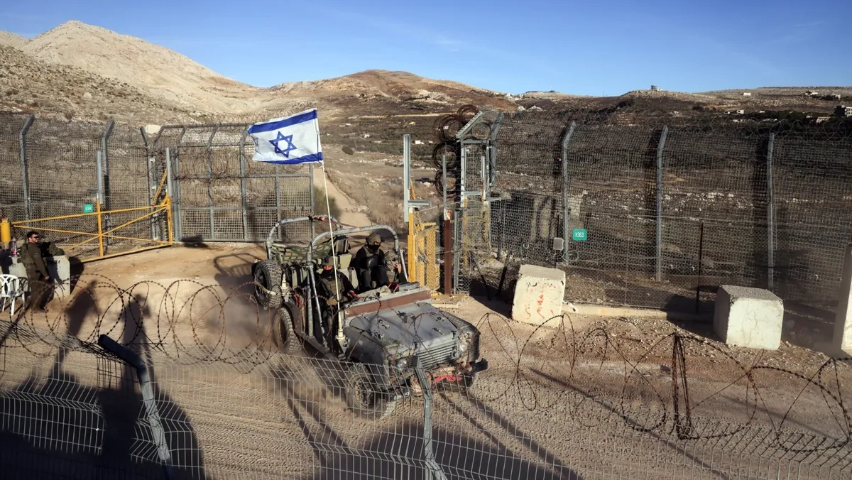 مركبة عسكرية إسرائيلية تمر عبر خط وقف إطلاق النار بين مرتفعات الجولان المحتلة وسوريا، كما شوهدت من مجدل شمس في مرتفعات الجولان. 15 ديسمبر 2024 - Reuters