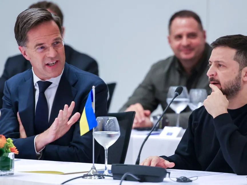 الأمين العام لحلف شمال الأطلسي مارك روته (يسار) مع الرئيس الأوكراني فولوديمير زيلينسكي في عشاء العمل لمجلس الناتو وأوكرانيا في بلجيكا. 17 أكتوبر 2024 - reuters