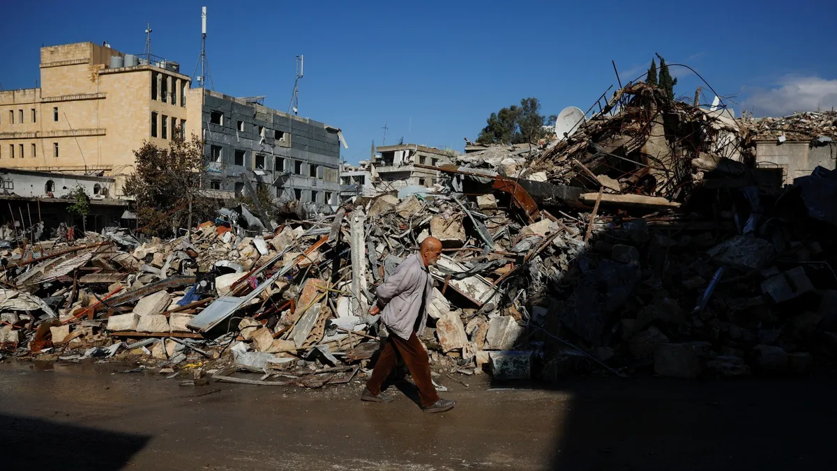 رجل يمر أمام أنقاض مباني مدمرة في بلدة النبطية جنوبي لبنان. 28 نوفمبر 2024 - REUTERS