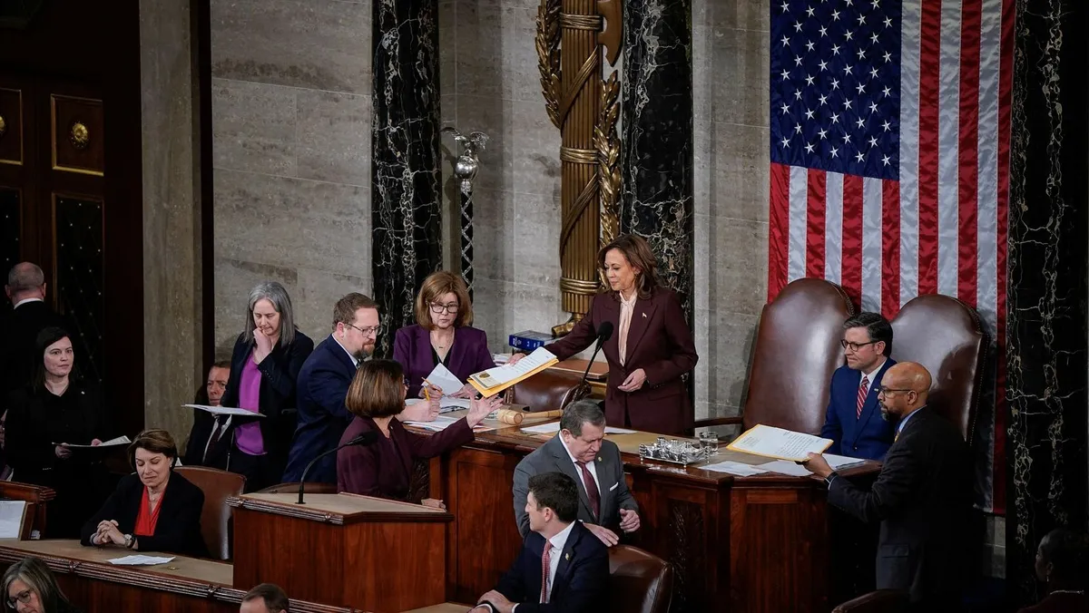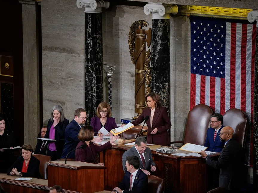 وتم التصديق على نتائج الانتخابات في الولايات الخمسين ومنطقة العاصمة، في حفل رسمي قصير خلال جلسة مشتركة لمجلس النواب ومجلس الشيوخ، ترأستها نائبة الرئيس كامالا هاريس، منافسة ترمب في هذه الانتخابات.
