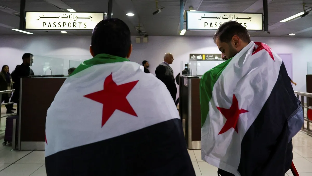 ركاب يرتدون الأعلام السورية في صالة الوصول بمطار دمشق. 7 يناير 2025 - Reuters