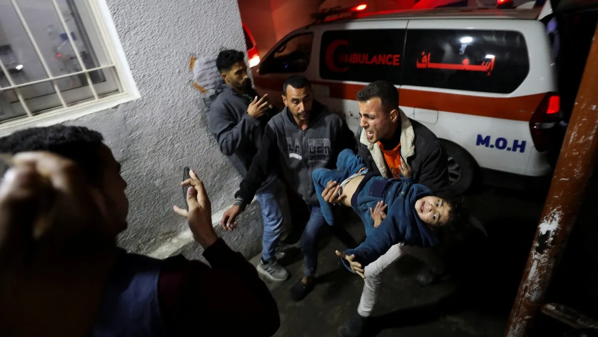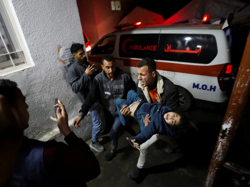 طفل فلسطيني مصاب يتم نقله إلى المستشفى بعد غارة إسرائيلية في مدينة غزة وذلك بعد إعلان التوصل لوقف إطلاق النار. 15 يناير 2025 - Reuters