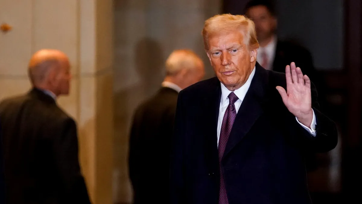 الرئيس الأميركي دونالد ترمب يلوح بيده داخل مبنى الكابيتول في العاصمة واشنطن بالولايات المتحدة. 20 يناير 2025 - Reuters