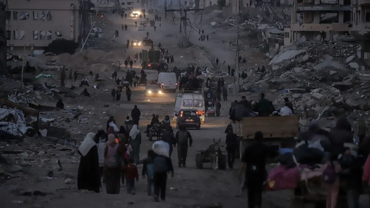 نازحون فلسطينيون أمام مبان مدمرة أثناء عودتهم إلى شمال قطاع غزة. مدينة غزة. 28 يناير 2025 - Bloomberg