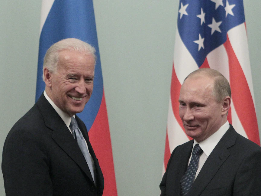 الرئيس الروسي فلاديمير بوتين، حين كان رئيساً للوزراء، يصافح الرئيس الأميركي جو بايدن، عندما كان نائباً للرئيس، خلال لقاء في موسكو - 10 مارس 2011 - REUTERS