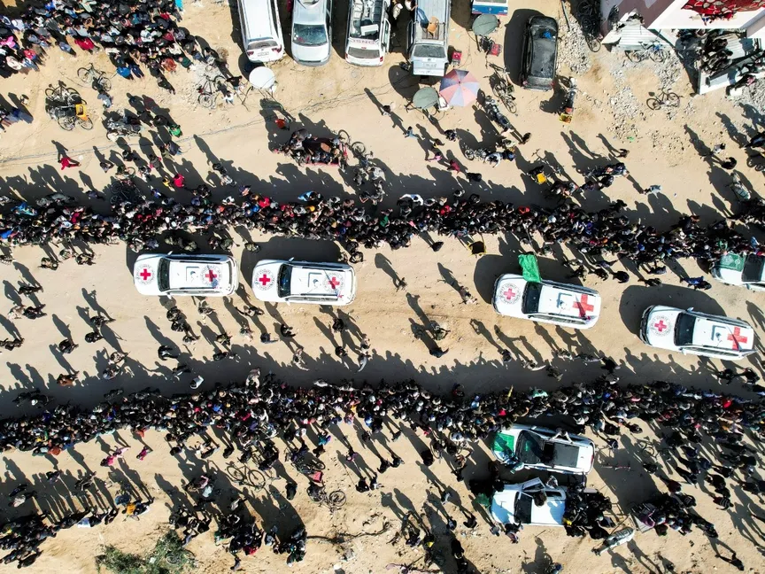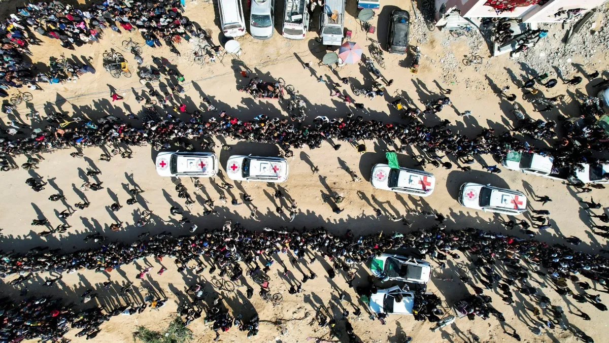 مركبات الصليب الأحمر عقب تتسلم محتجزين إسرائيليين من كتائب "القسّام" في خان يونس بجنوب قطاع غزة. 30 يناير 2025 - reuters