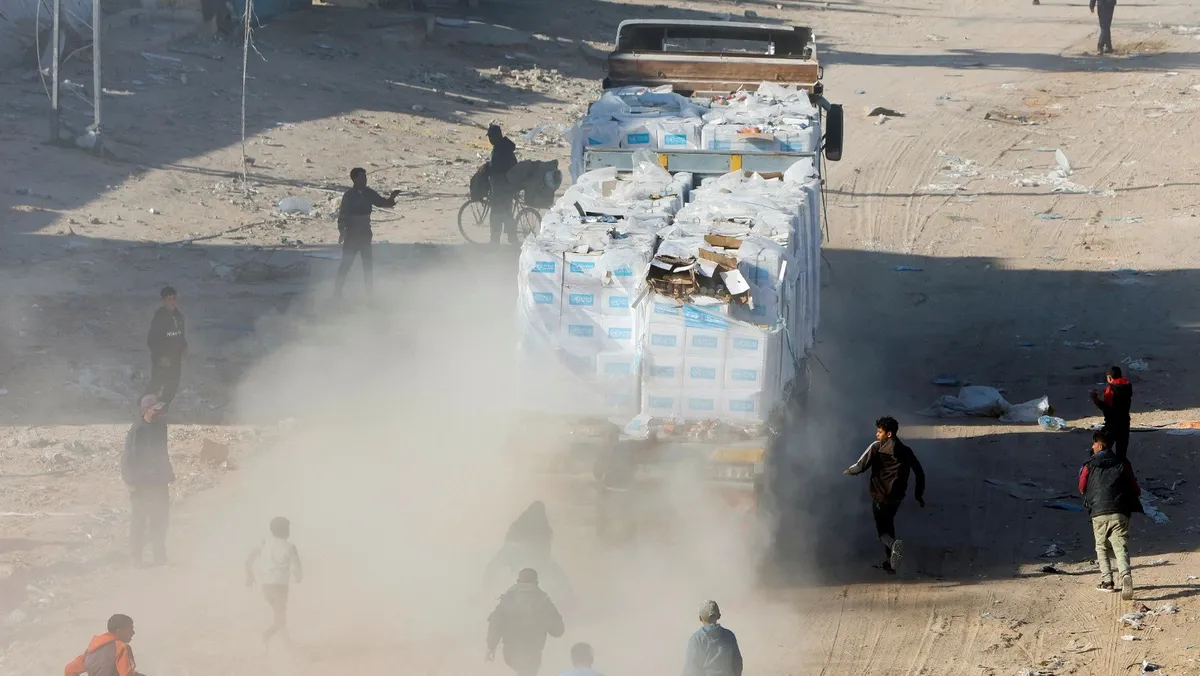 فلسطينيون يحاولون اللحاق بشاحنة مساعدات في رفح جنوب قطاع غزة. 21 يناير 2025 - REUTERS