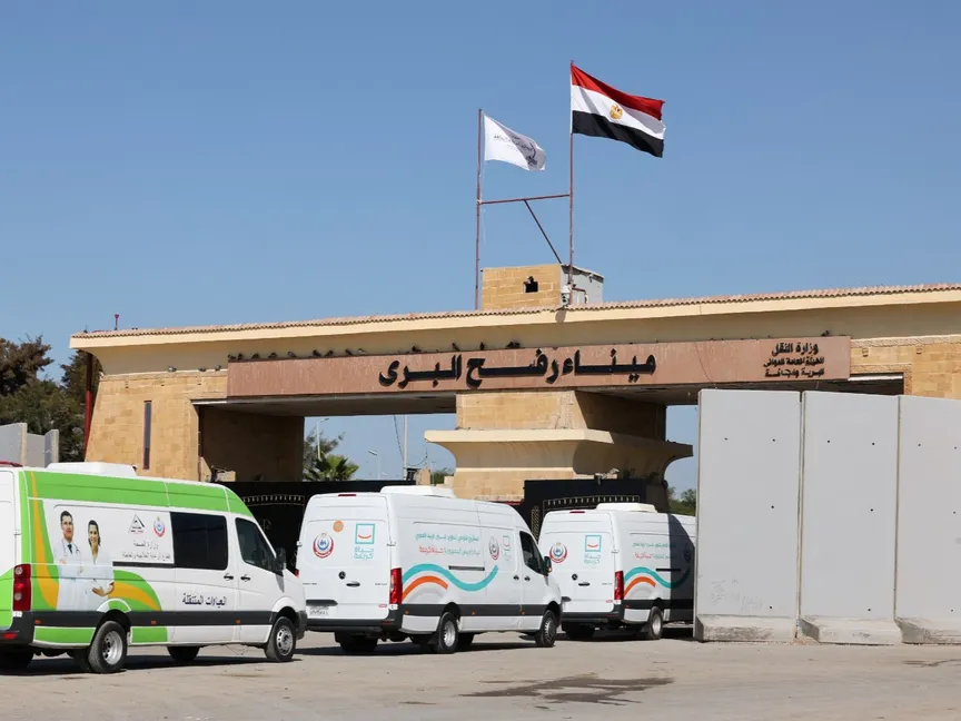سيارات إسعاف تدخل معبر رفح الحدودي بين مصر وقطاع غزة تمهيداً لنقل مصابين ومرضى للعلاج في المستشفيات المصرية ضمن اتفاق وقف إطلاق النار بين إسرائيل وحركة حماس. 1 فبراير 2025 - Reuters