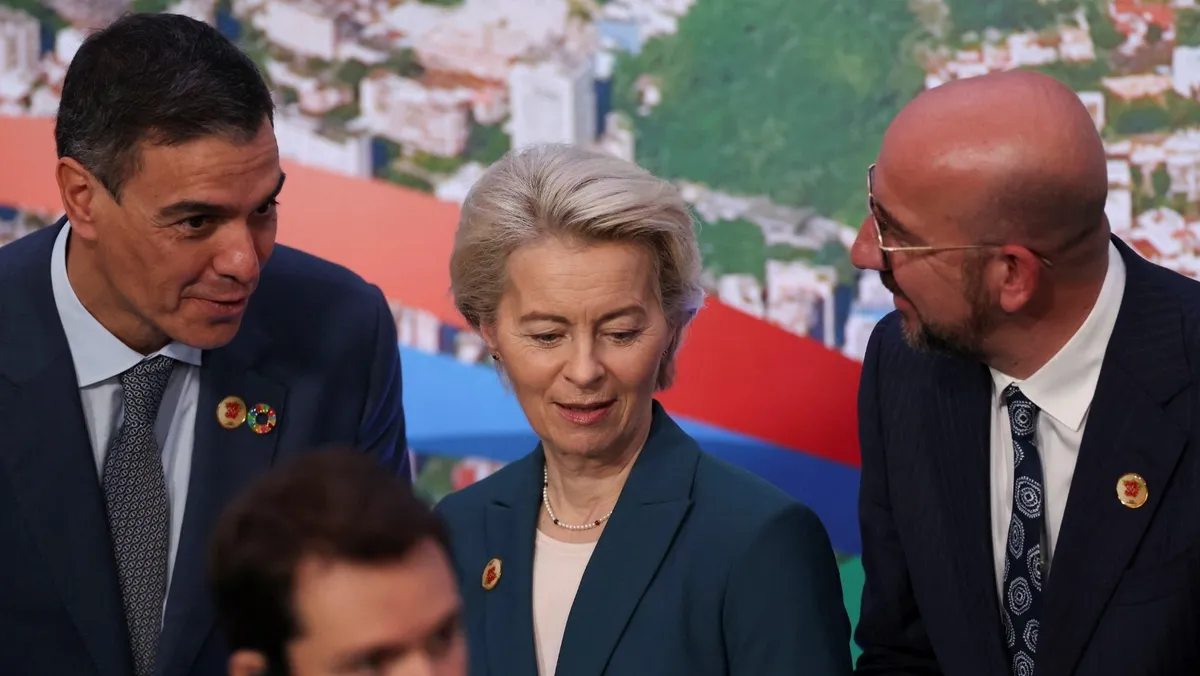 رئيس الوزراء الإسباني بيدرو سانشيز ورئيسة المفوضية الأوروبية أورسولا فون دير لاين ورئيس المجلس الأوروبي شارل ميشيل يتحدثون في قمة مجموعة العشرين في ريو دي جانيرو بالبرازيل. 19 نوفمبر 2024 - Reuters